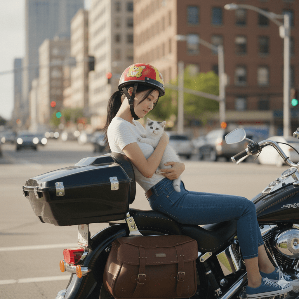 小琳背靠著行李箱,雙手像抱小baby那樣抱著小貓咪,對了,頭上還戴著臭小魚的「兒童」安全帽。