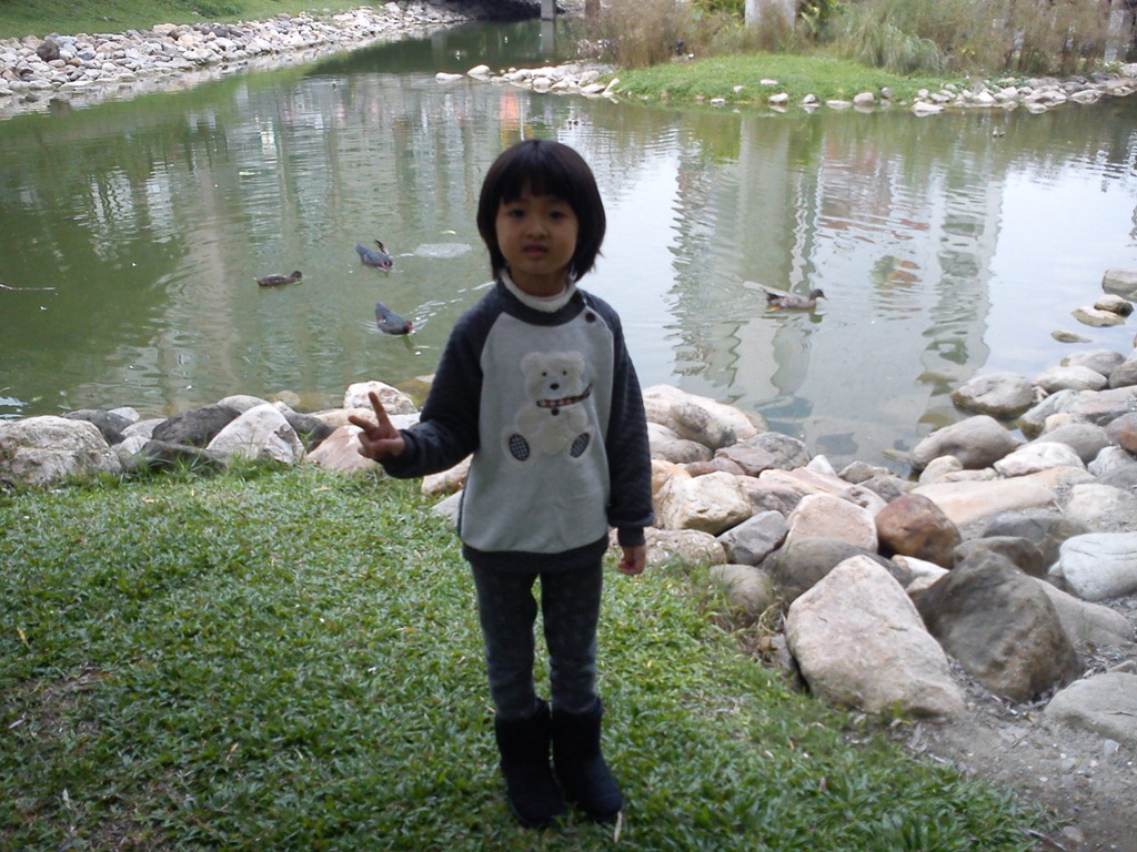 看到幾隻鴨鴨在小水池裡,就隨性給臭小魚照一張