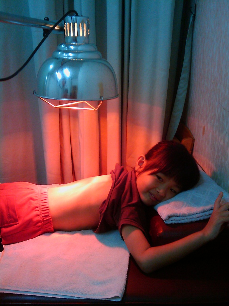 先暖暖背,然後在一些穴位貼上中藥小丸子,結束