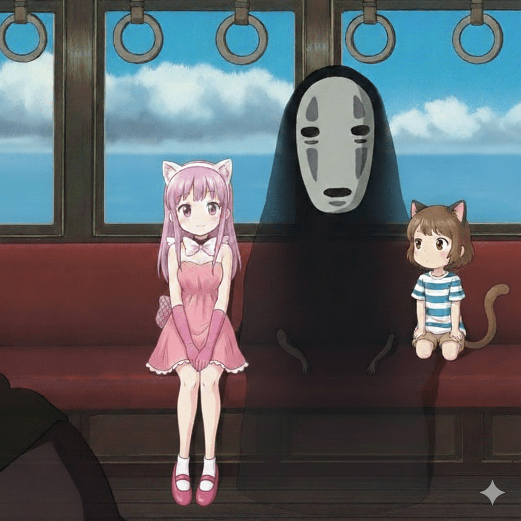 在月台上的時候,莉莉在腦海裡確實是浮現了這樣的想像,所以小龍女就在這班「神隱電車」上幫她實現了這一個想像,也就是說,小芳之所以會變成無臉男,源頭也是出自於她腦海中一度浮現的畫面..千尋和無臉男並肩坐在電車上的畫面。