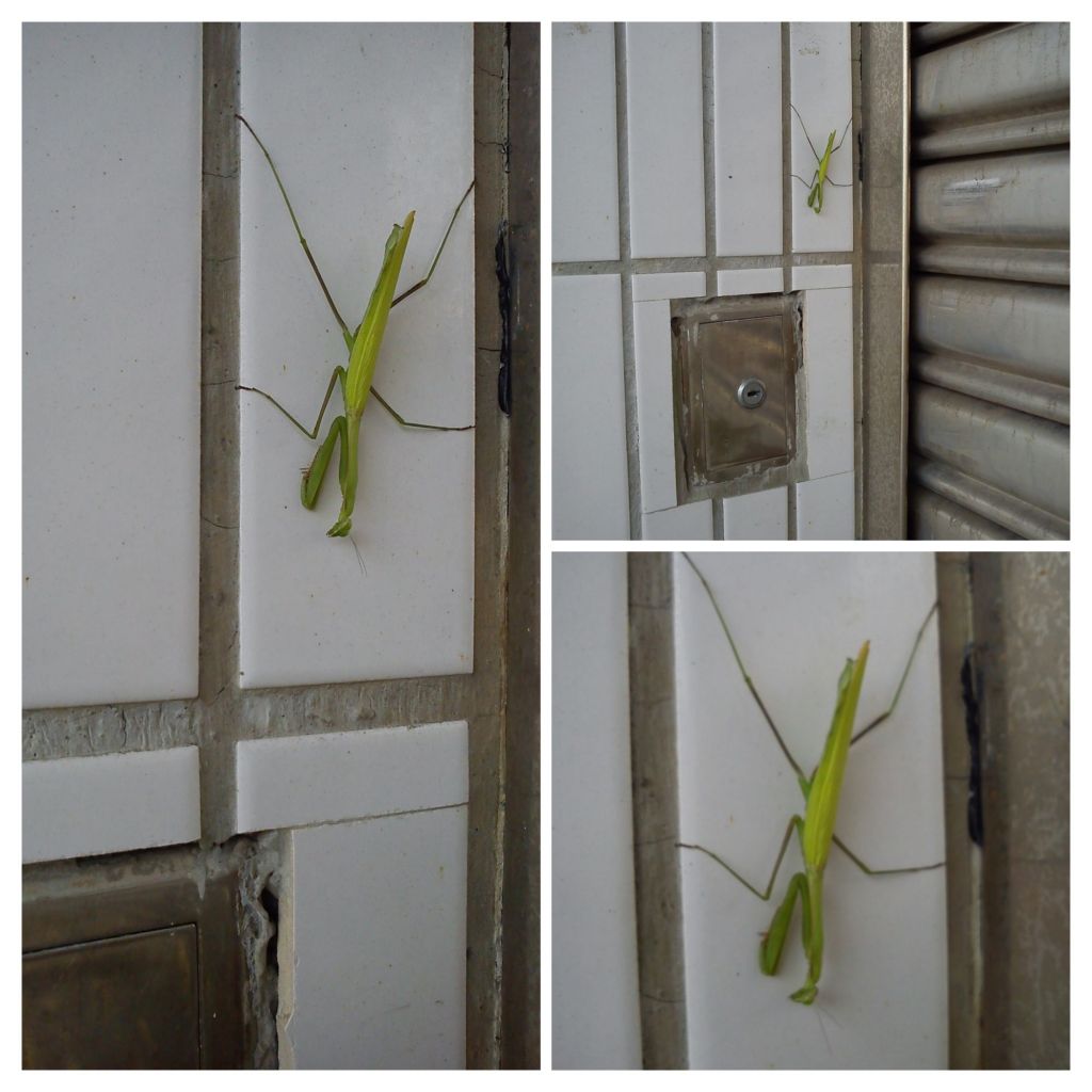 天曉得是不是用單、雙數來區分顏色,這隻「螳螂君4號」果然..是綠色的,而出現的位置似乎也循著某種讓人頭皮發麻規律~「一天靠近你一點、絕對要讓你看見」..的規律,這次是在倉庫鐵捲門開關的旁邊。
